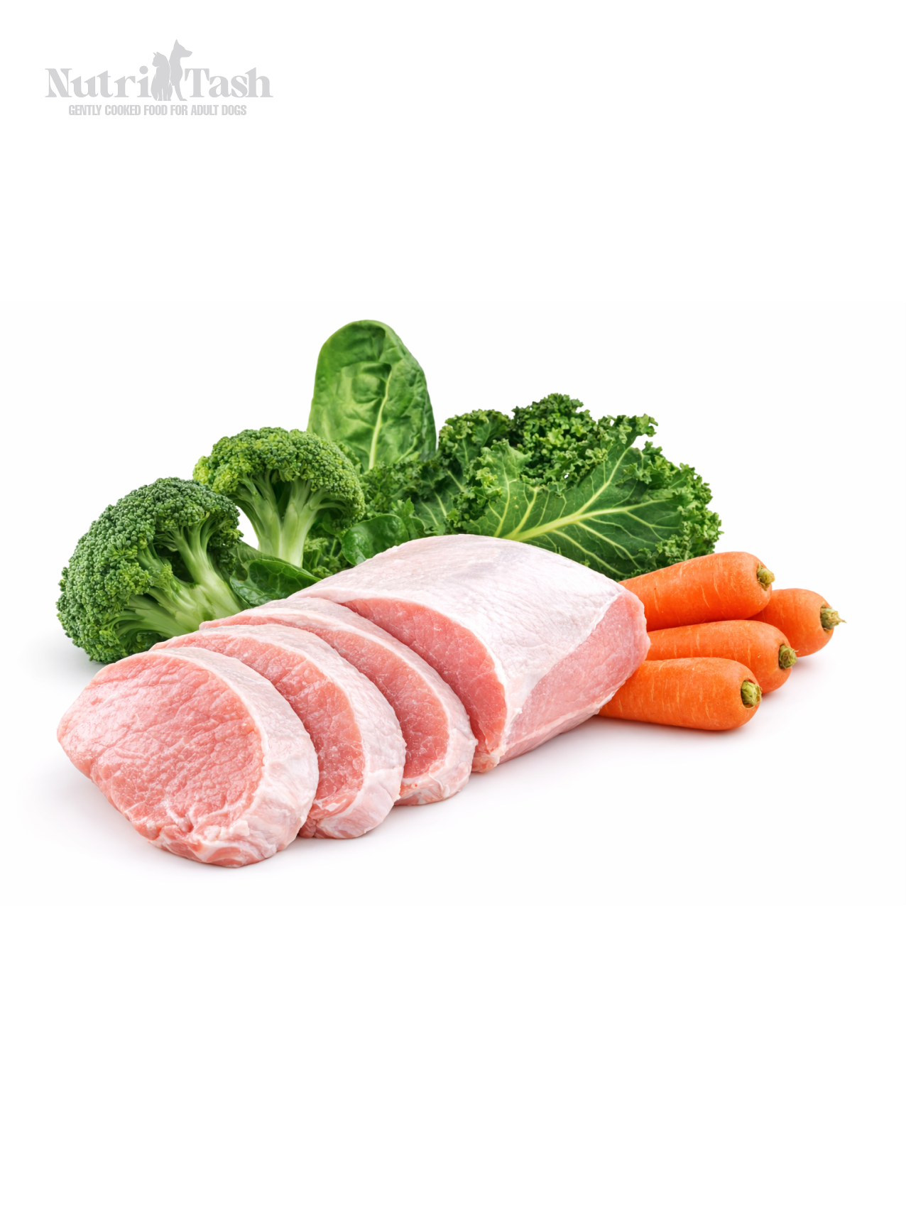 NUTRITASH Gently Cooked Pork & Veggie Blend Dog Food is a wholesome, human-grade meal made with premium lean pork and fresh vegetables to support your dog’s overall health and vitality. Gently cooked to preserve essential nutrients and natural flavors, this highly digestible recipe is ideal for adult dogs of all breeds, helping promote strong muscles, healthy digestion, and sustained energy.